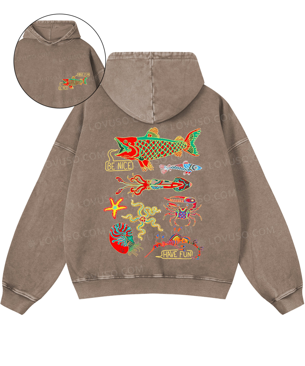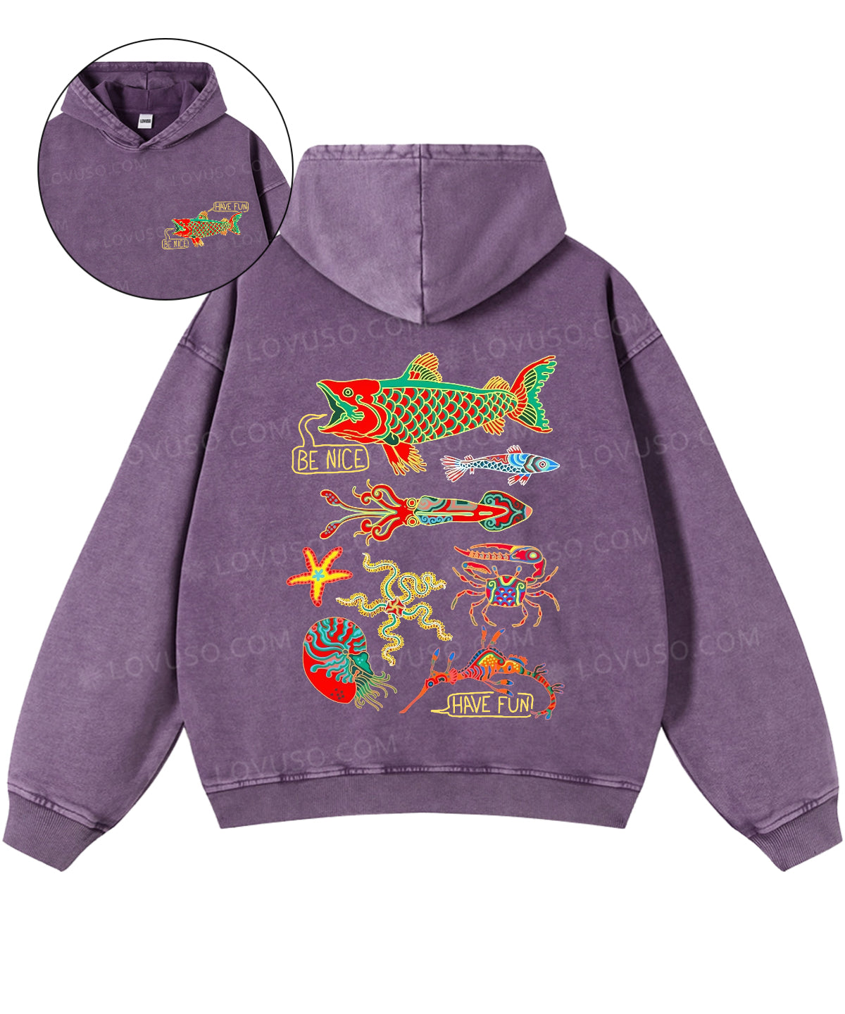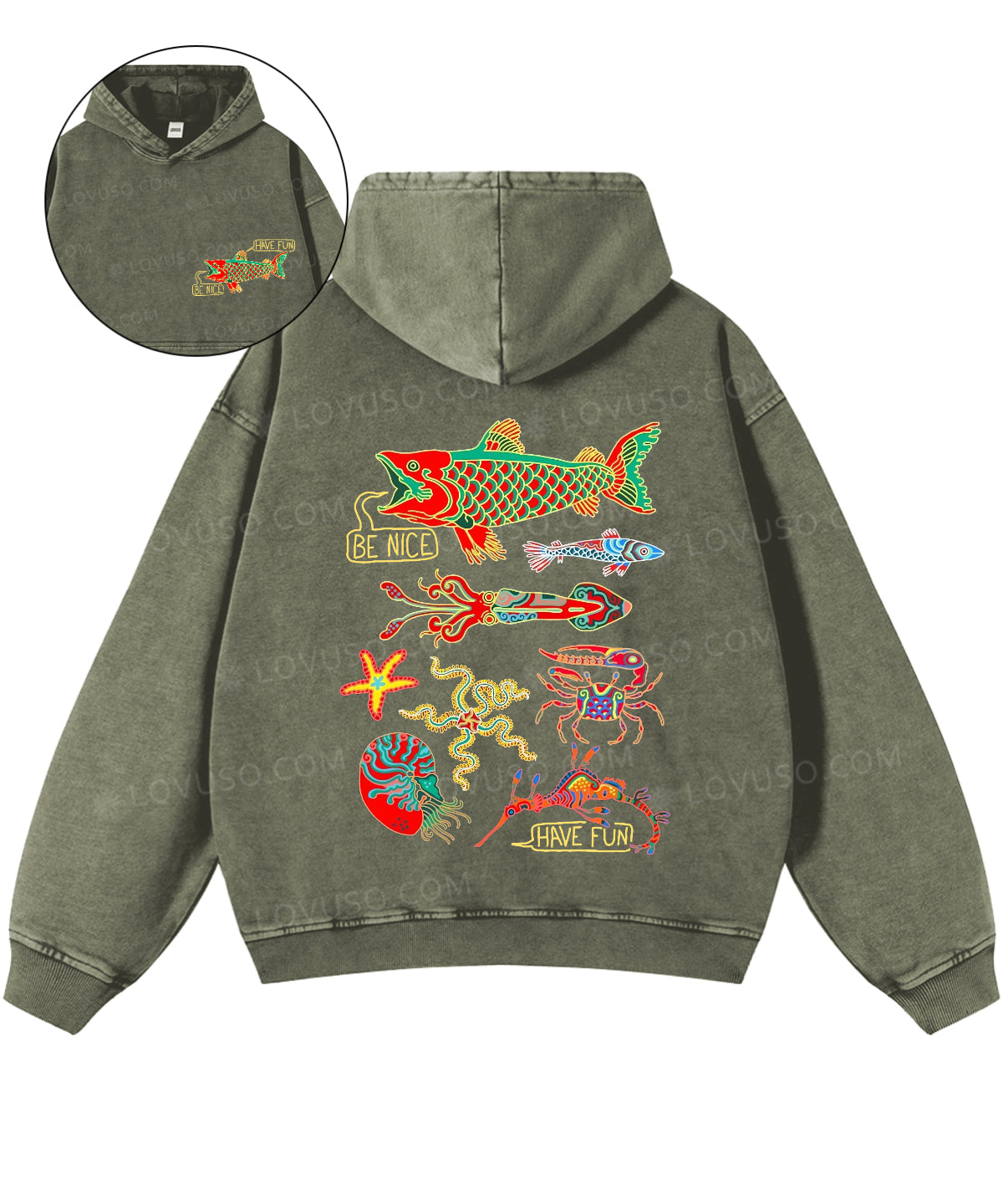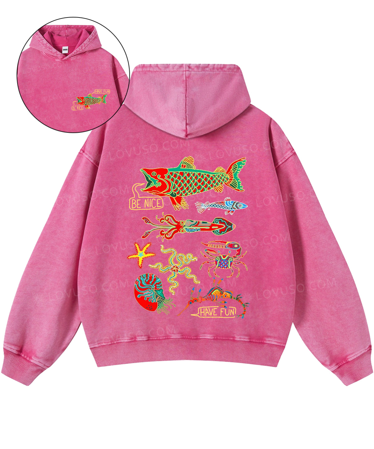 Retro Colorful Fish Be Nice Have Fun Double Sided Washed Hoodie