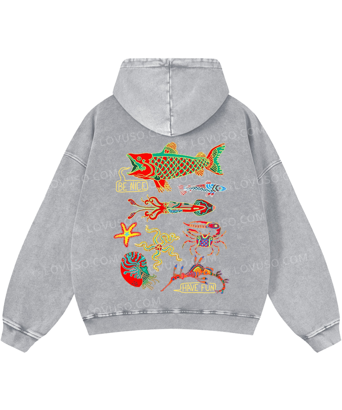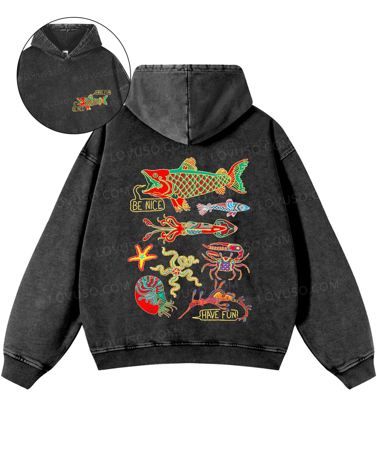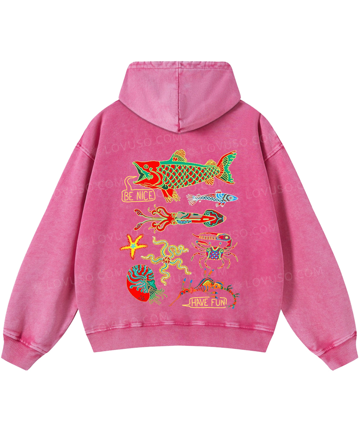 Retro Colorful Fish Be Nice Have Fun Double Sided Washed Hoodie