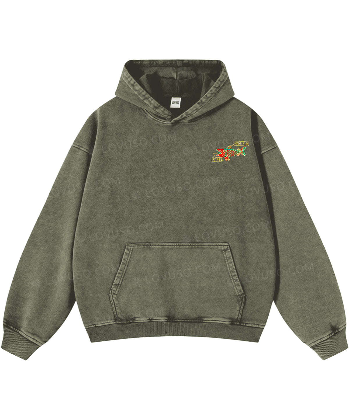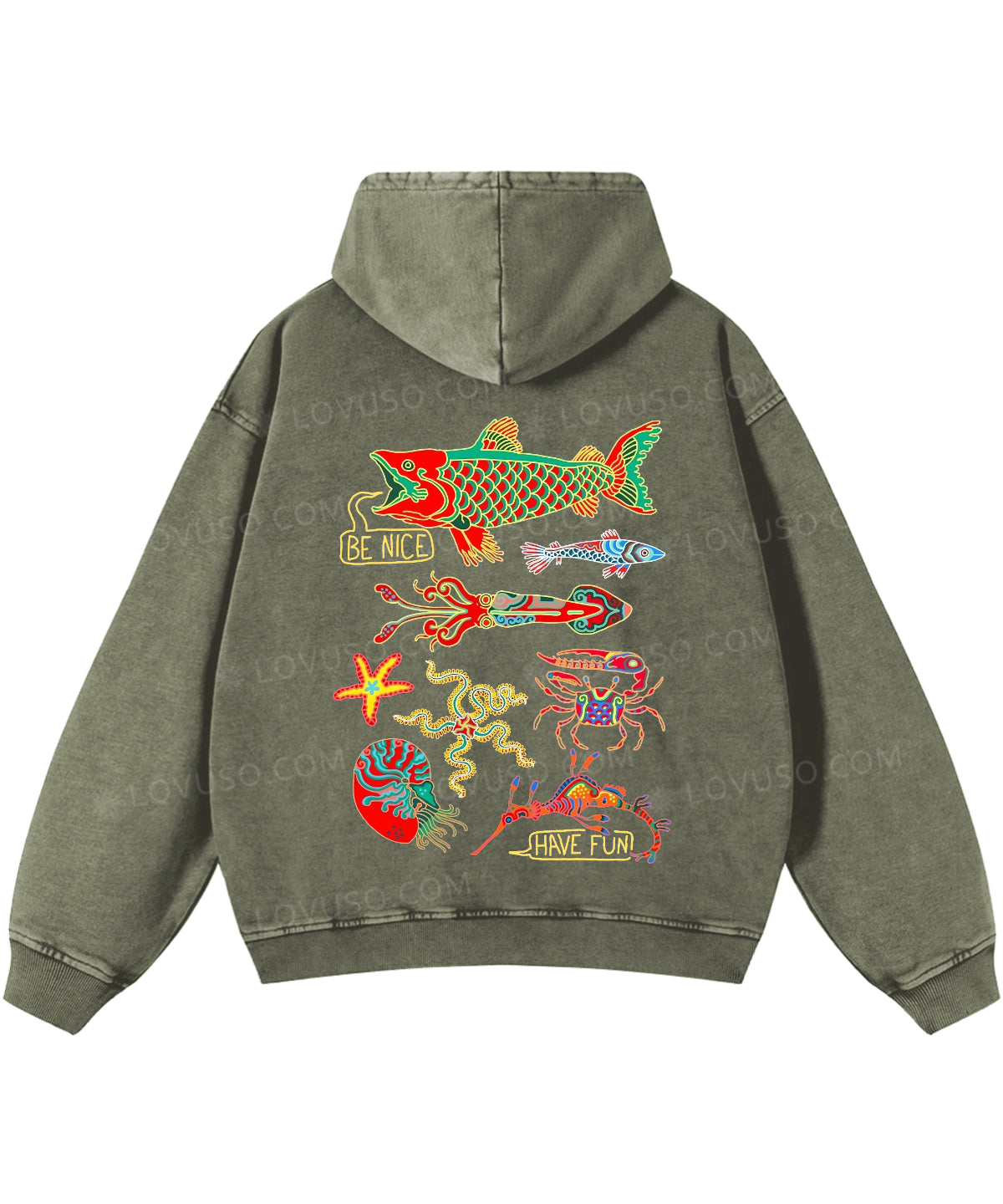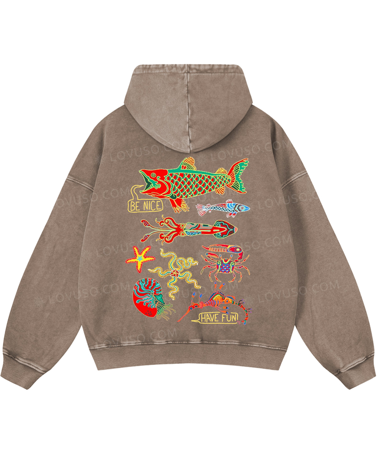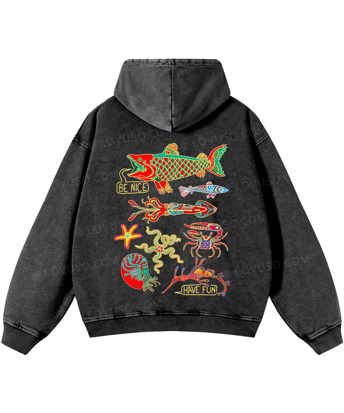Retro Colorful Fish Be Nice Have Fun Double Sided Washed Hoodie