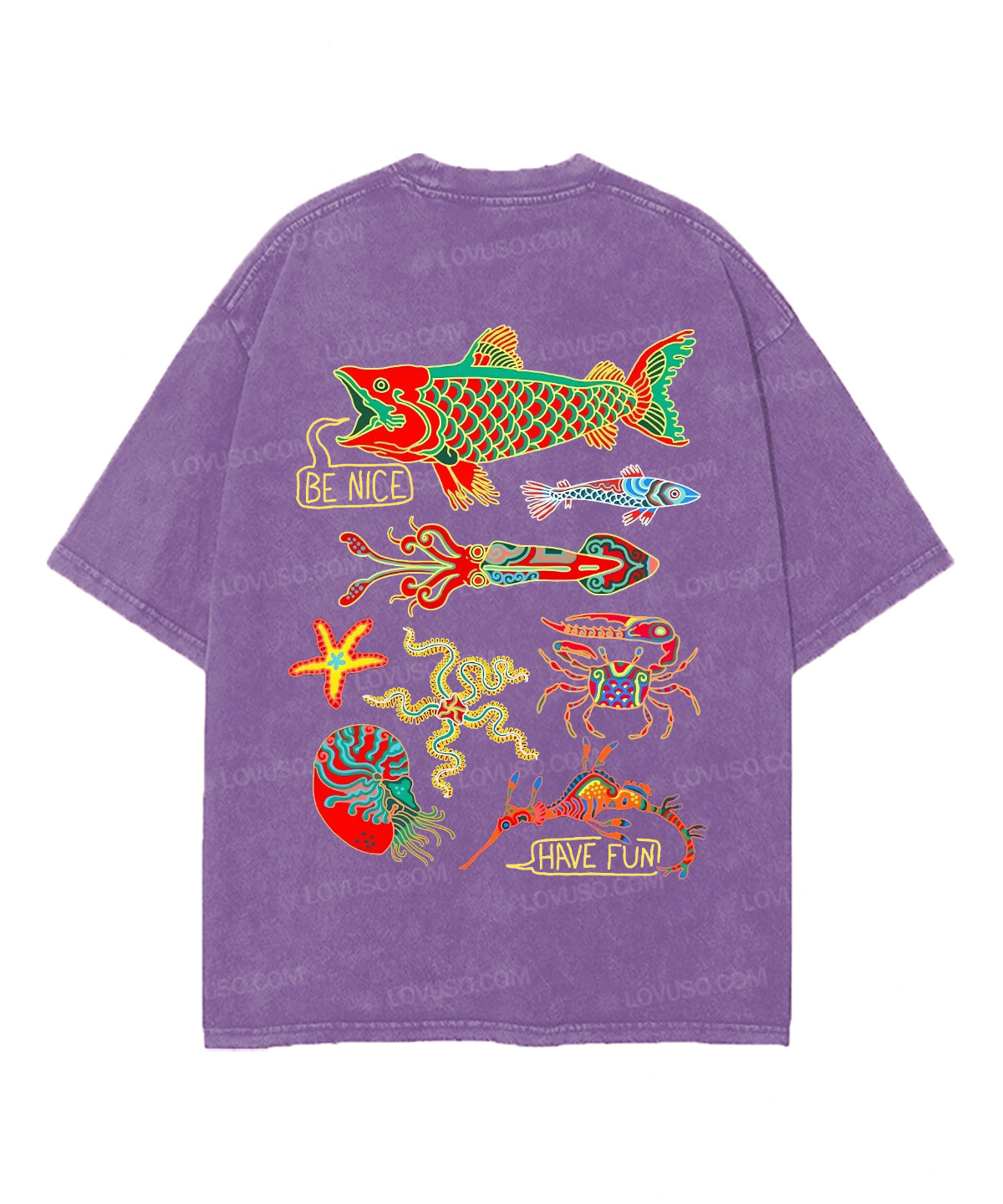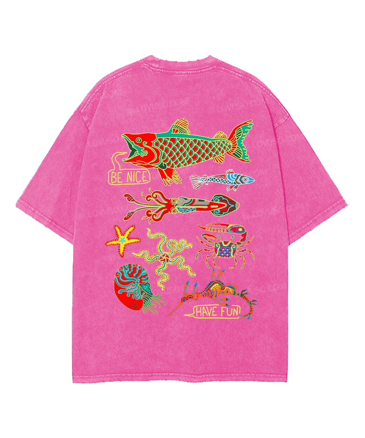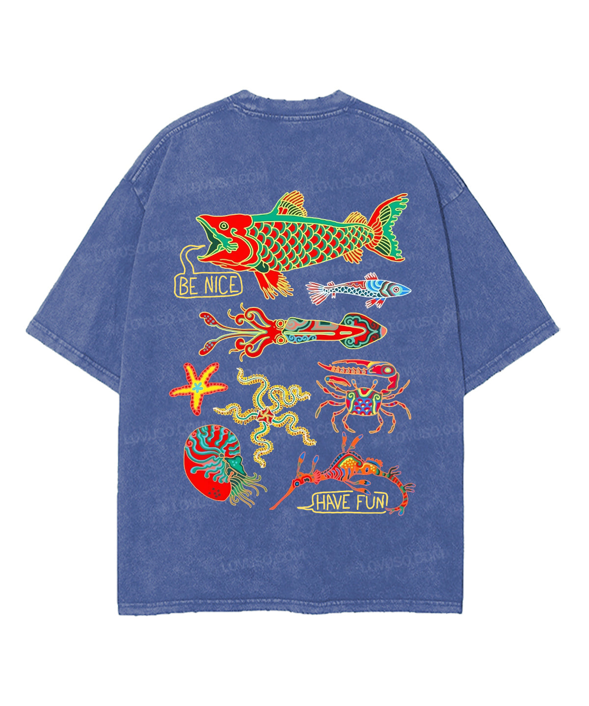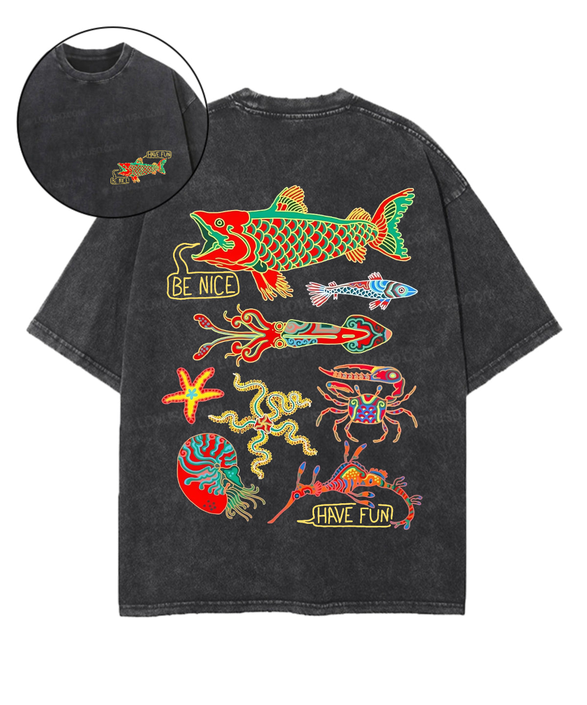 Retro Colorful Fish Be Nice Have Fun Double Sided Washed T-shirt