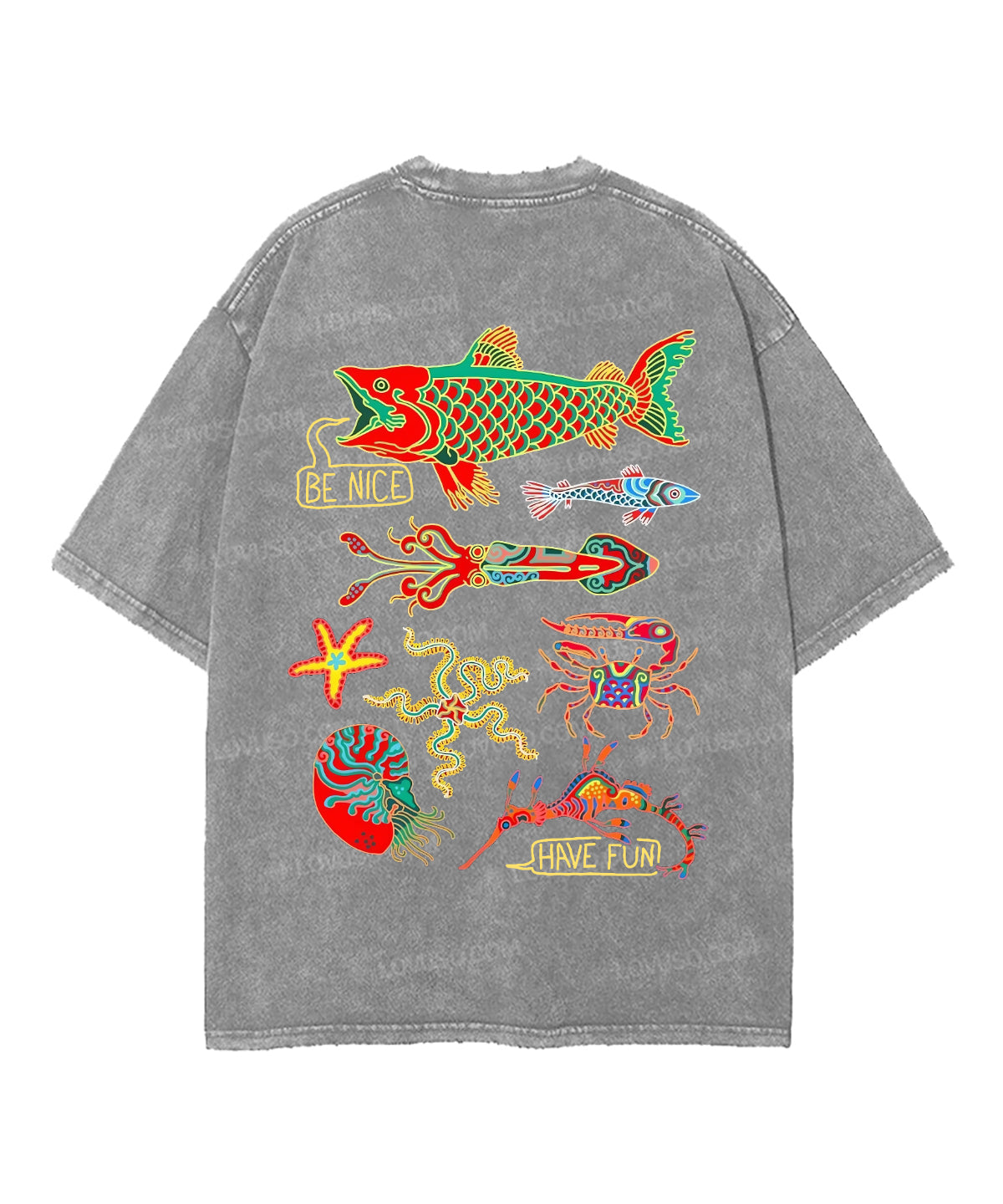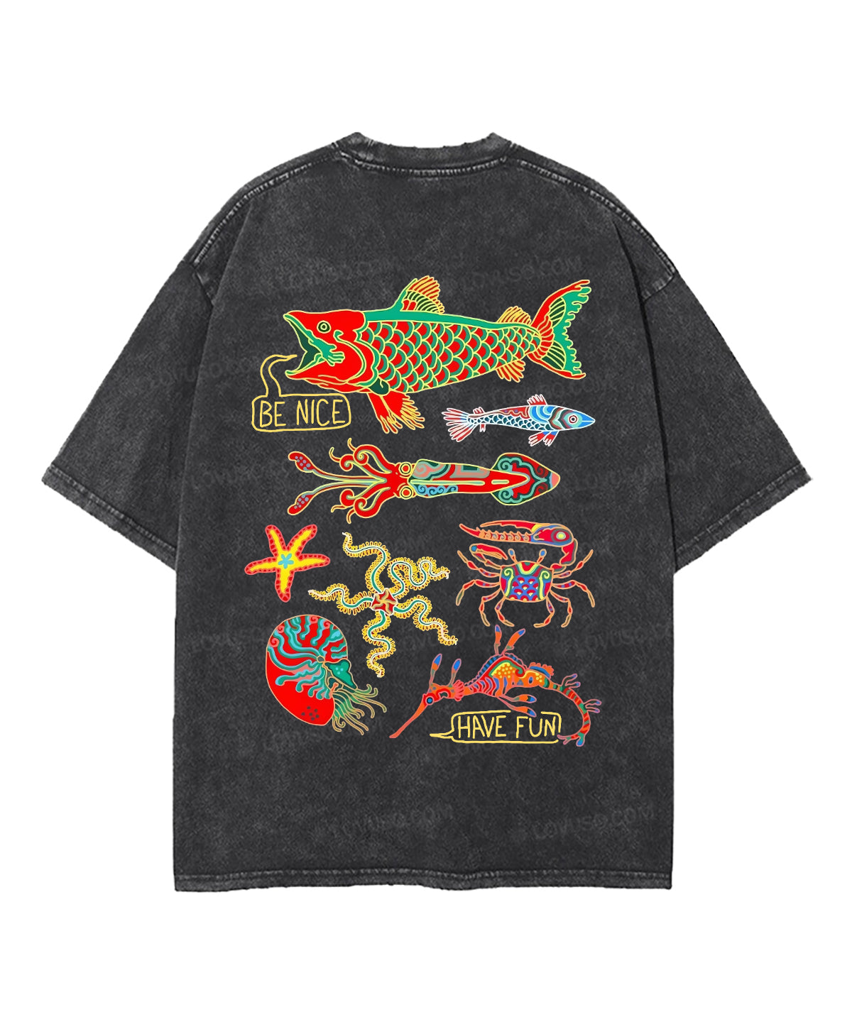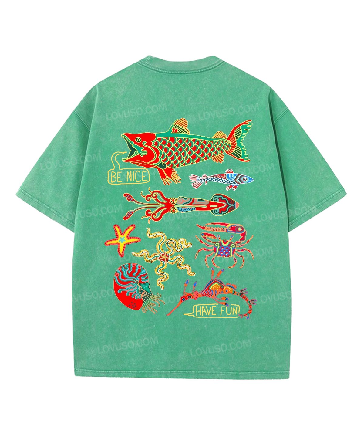 Retro Colorful Fish Be Nice Have Fun Double Sided Washed T-shirt