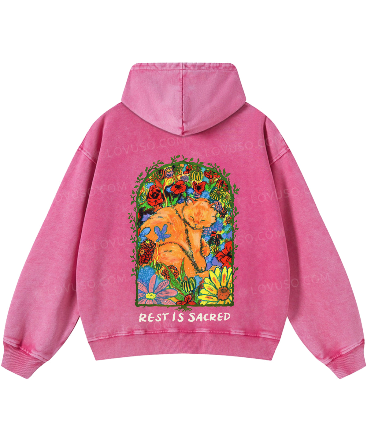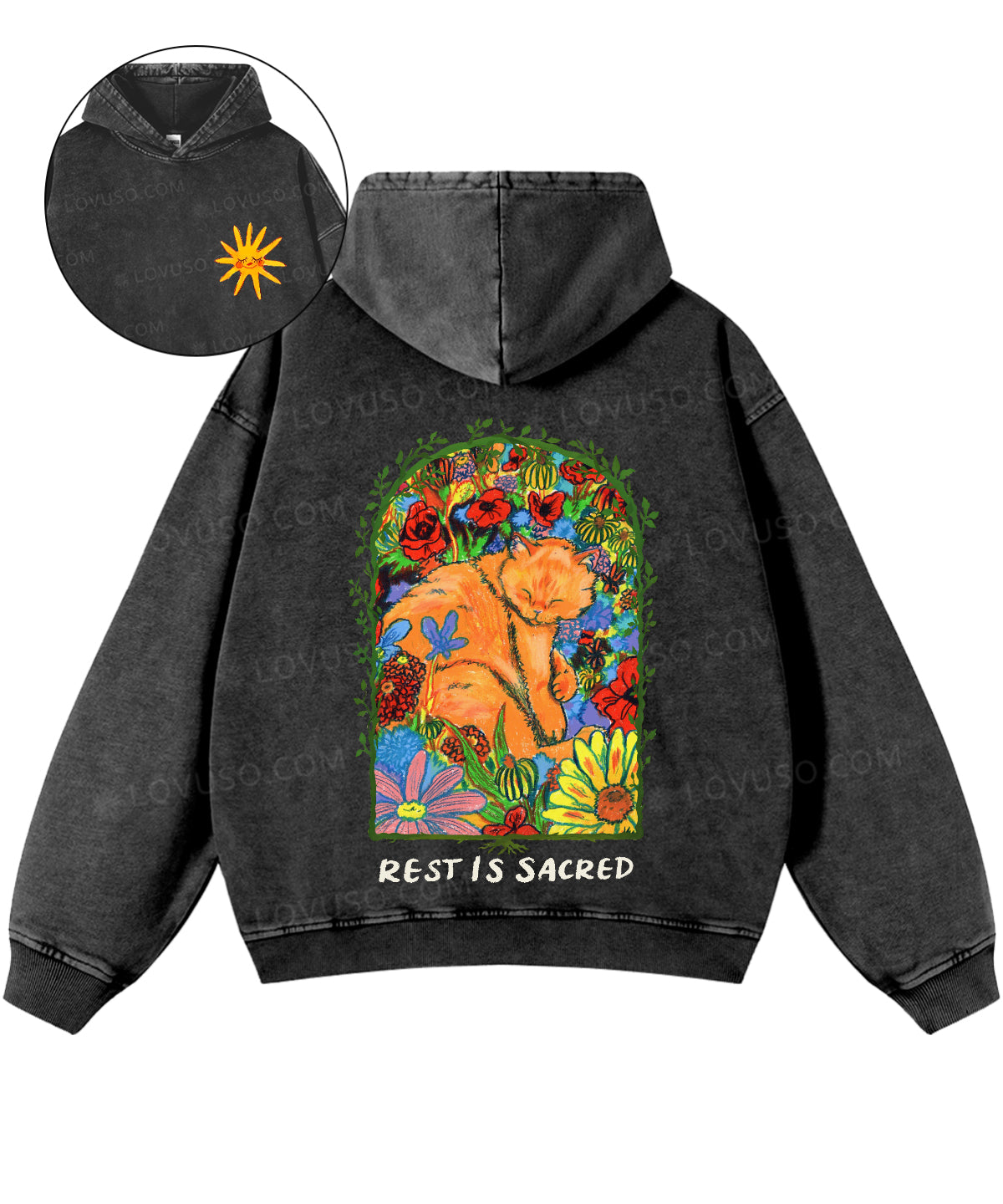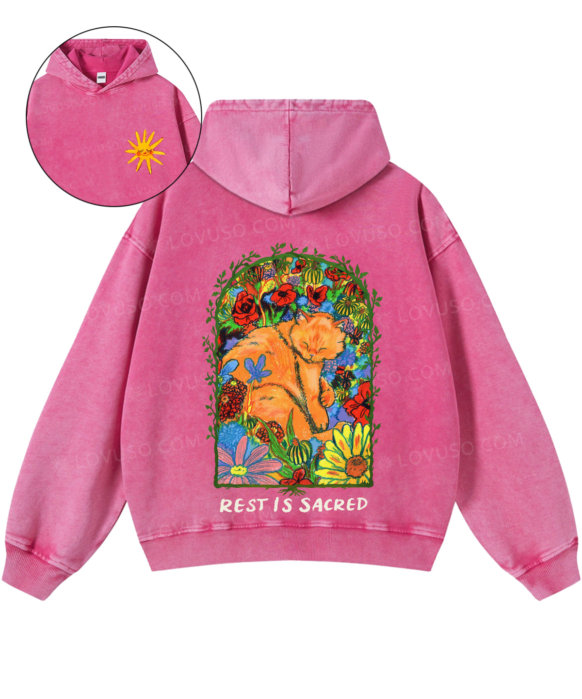 Retro Flower And Cat Rest Is Sacred Double Sided Washed Hoodie