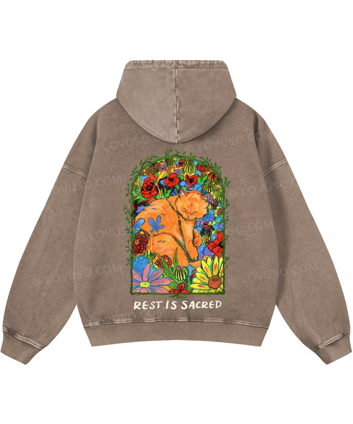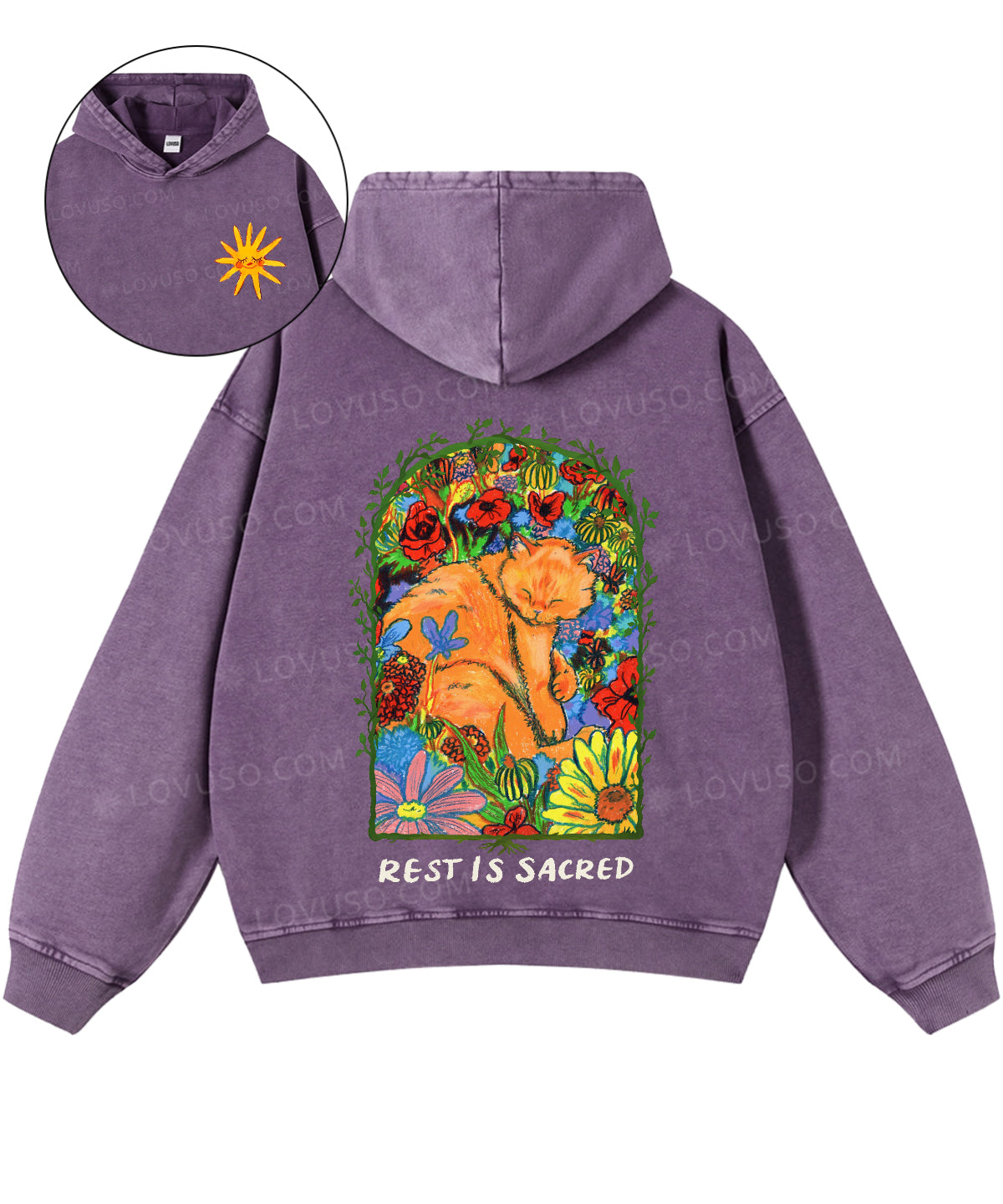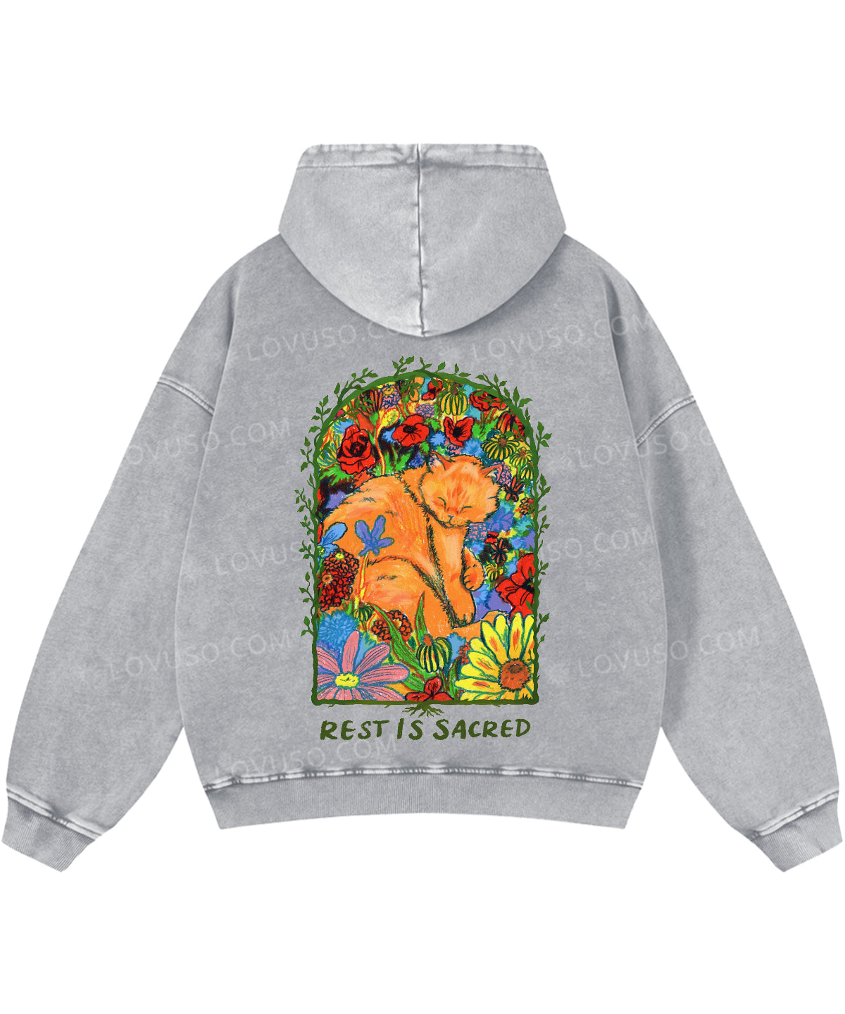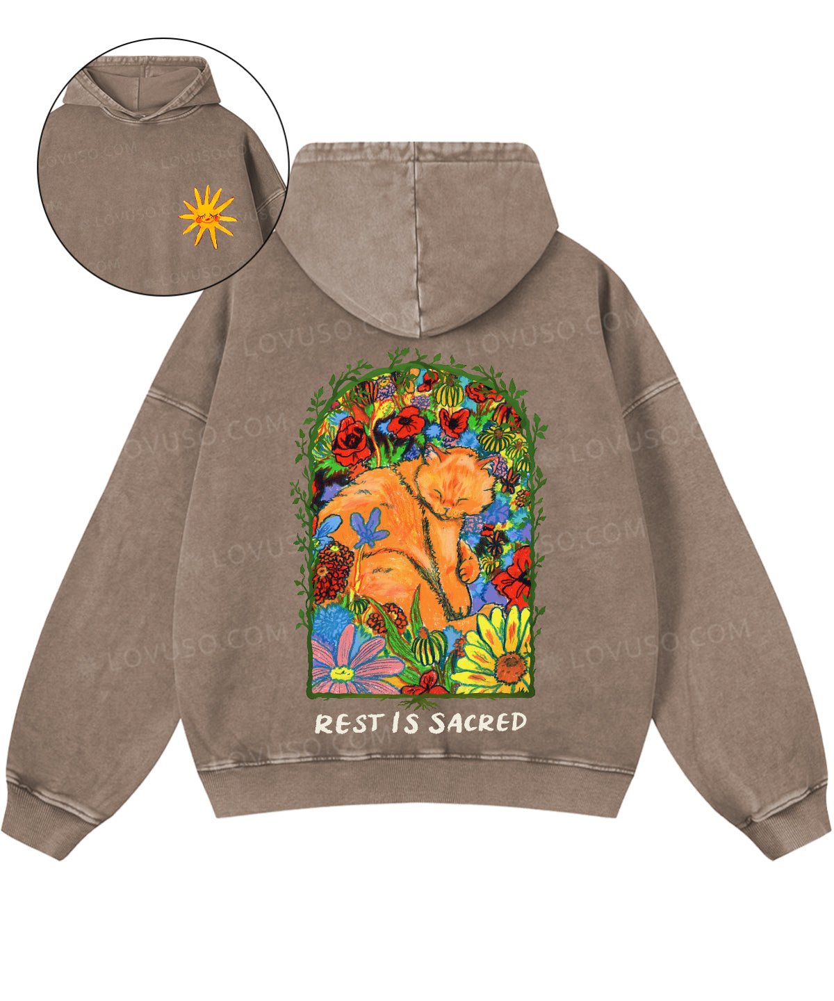 Retro Flower And Cat Rest Is Sacred Double Sided Washed Hoodie
