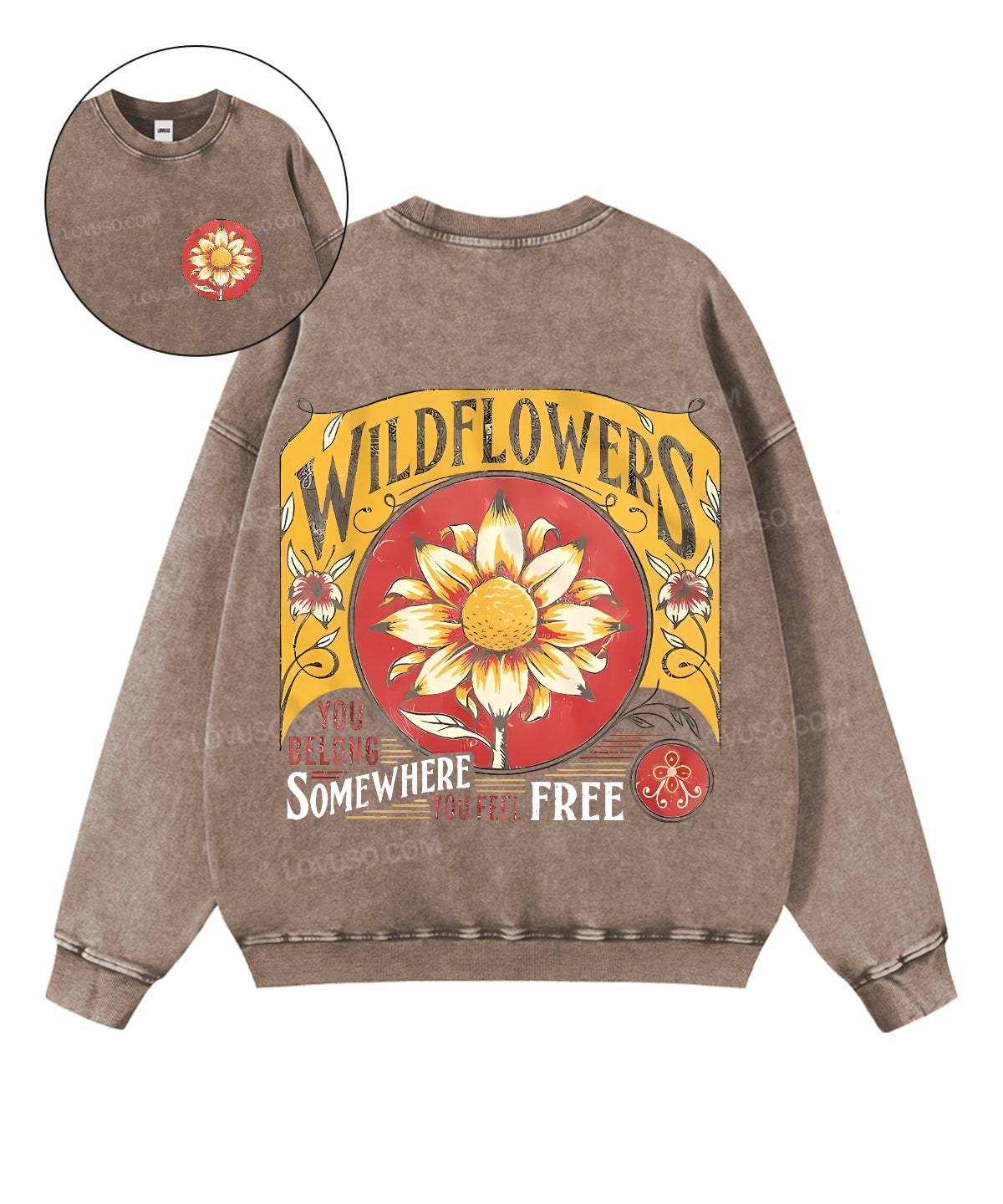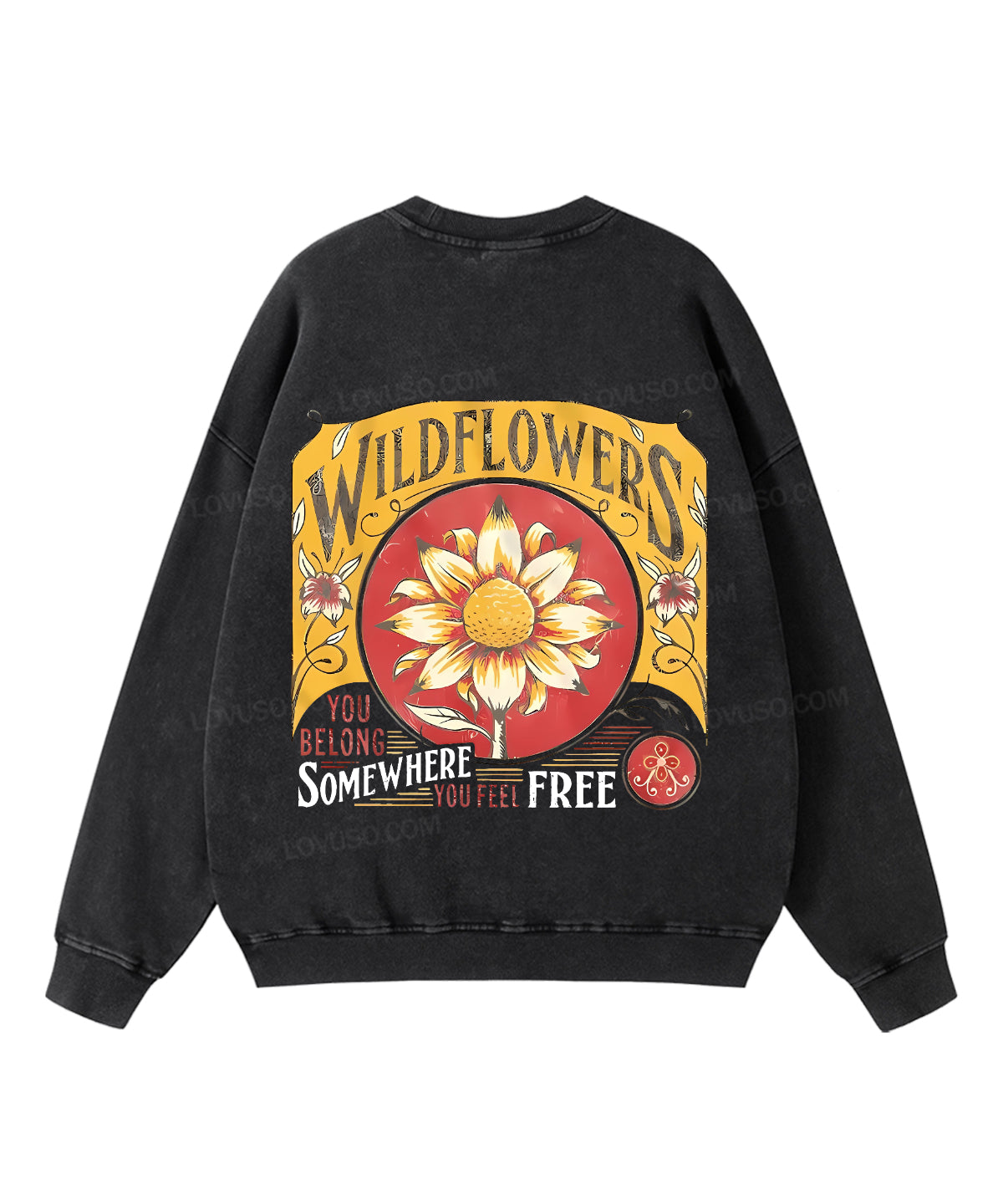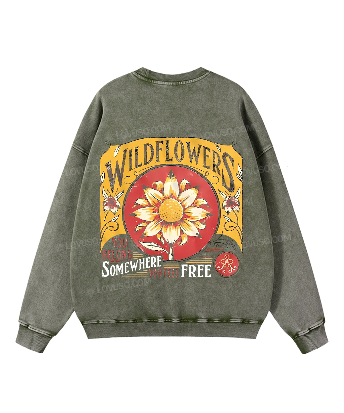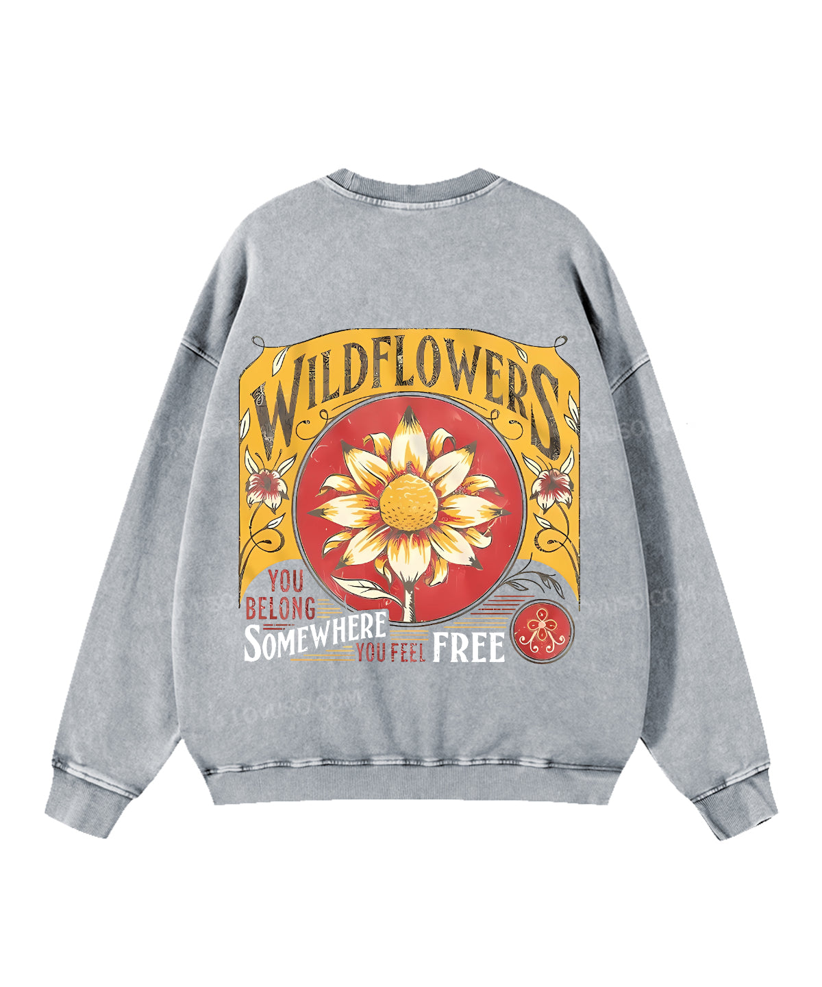 Retro Wildflowers You Belong Somewhere You Feel Free Double Sided Washed Sweatshirt