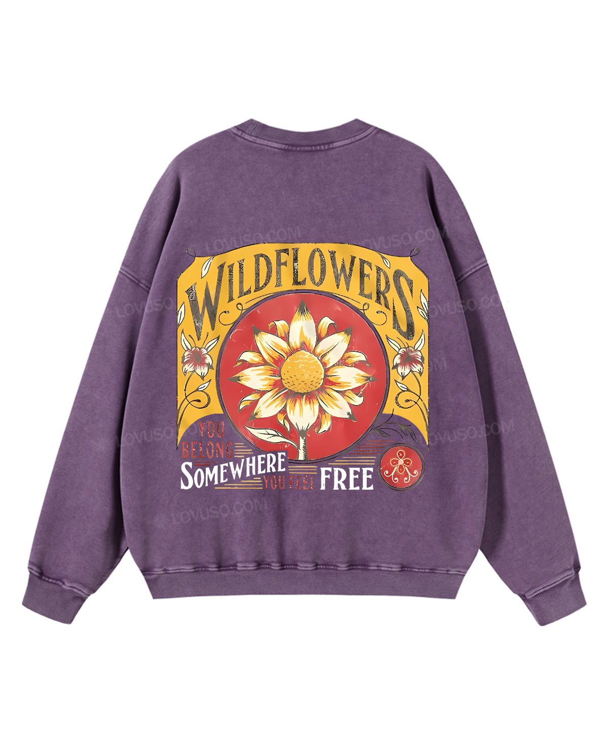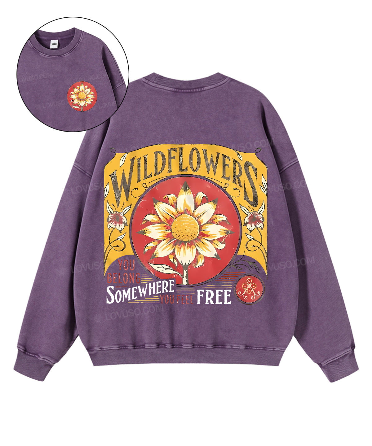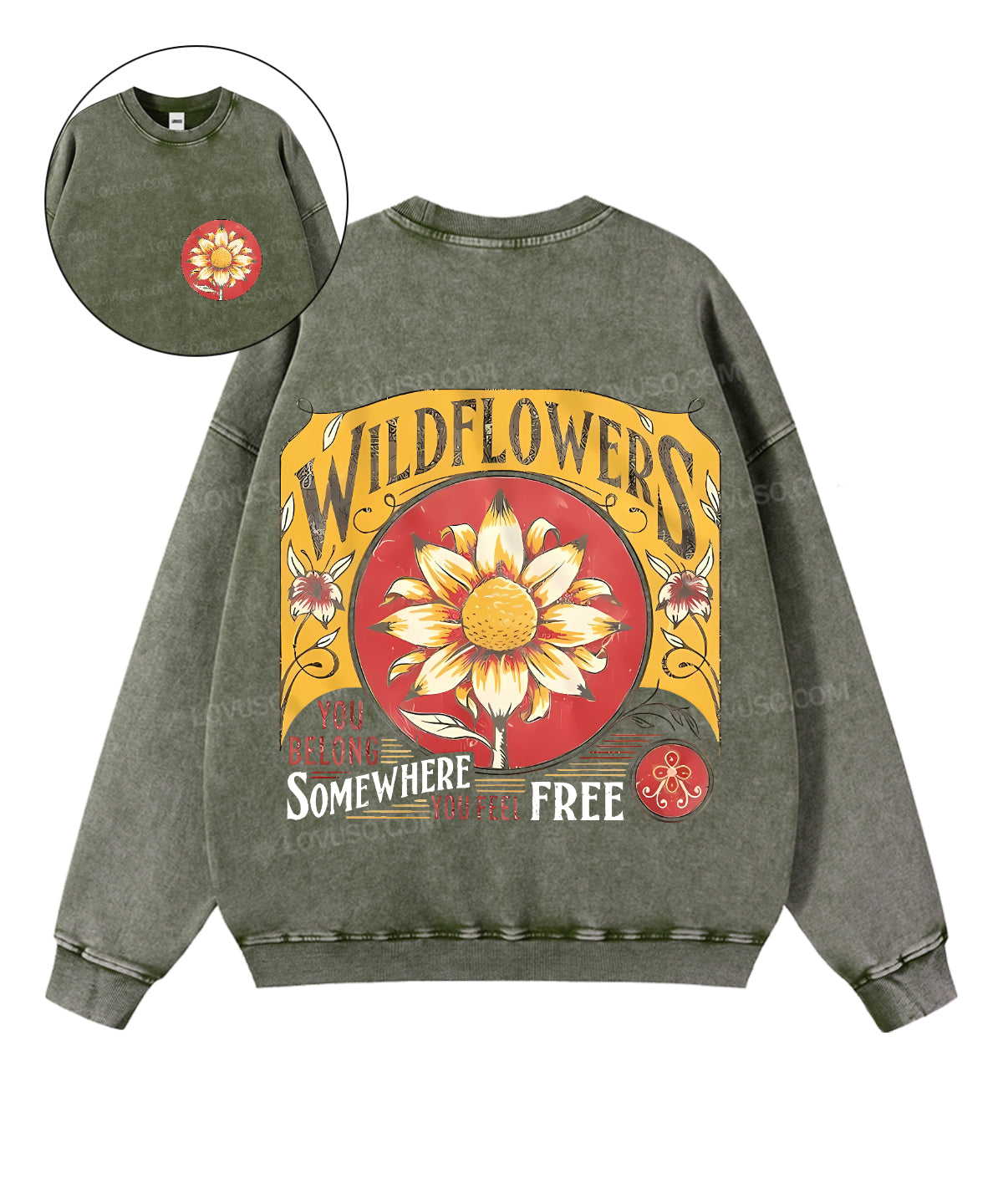 Retro Wildflowers You Belong Somewhere You Feel Free Double Sided Washed Sweatshirt